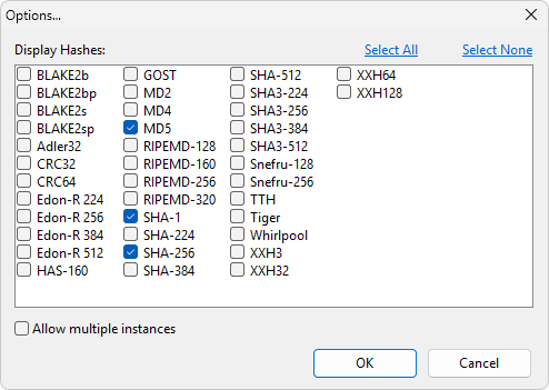 Version 1.5.2 2025-11-06 Added allow multiple instances option Version 1.5.1 2025-07-16 Added dark mode Fixed sorting ListView by using the column doesn't work Fixed opening multiple files by 'Add Files' doesn't work Version 1.5 2024-05-05 Added integrate into shell context menu Added add folder (advanced) Added HTML report Added TXT report Added CSV report Added restore view data when switching view mode Improved export to HTML page Version 1.4 2024-04-28 Added benchmark Added show file icons Added show grid lines Added change font Added ARM64 version Version 1.3 2023-10-05 Added supported XXH32, XXH64, XXH3, XXH128 Version 1.2 2009-06-21 Version 1.1 2008-01-17 Version 1.0 2007-11-28
